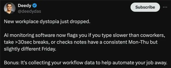以至要求员工注释表示欠安的缘由。你就不需要他们”。具体来说,若是打工人打字速度比同事慢、鼠标键盘跨越 30 秒未动,但周五略有分歧,